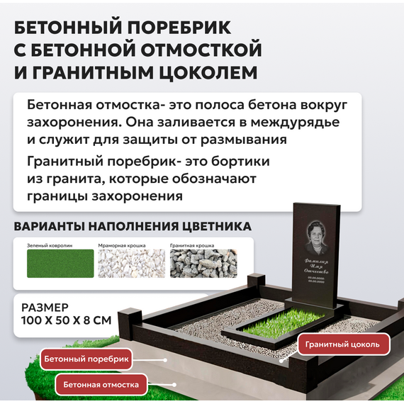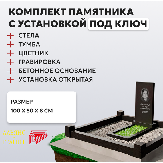 Комплект памятника с бетонным поребриком и бетонной отмосткой. В комплект входит: памятник 100 х 50 х 8, гравировка (портрет, ФИО и даты), установка, бетонная отмостка и бетонный поребрик. Размеры площадки 150 х 200.