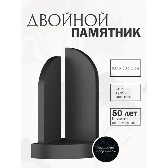 Оригинальная и неповторимая модель памятника, которая красиво и органично дополнит и одиночную могилу, и семейное захоронение. Конструкция мемориального сооружения представлена двумя прямоугольными плитами разной высоты со срезанными полукругом верхушками. Обе они располагаются на едином основании, которое придает целостность всему изделию. Имея сглаженные формы, такое надгробие выразительно раскроет все самые трепетные и нежные чувства близких к покинувшим этот мир родным и всеми любимым людям, сохранив добрую и вечную память о них.