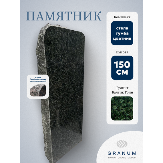 | Памятник корка Балтик грин гранит с необработанной тыльной стороной. Преимущества этого камня не только в его необыкновенной красоте, но и физических и механических свойствах. |