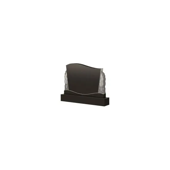 Довольно интересное воплощение ритуального искусства. Здесь присутствуют как классические черты, так и те, с помощью которых надгробие способно предстать перед взглядами окружающих как привлекательное и оригинальное памятное изделие. Так, основная часть выполнена в форме трапеции, у которой вместо ровной верхушки плавная волнообразная линия. Такие же очертания повторяет основание стелы, которое разделено с рабочим пространством тоненькой белой линией. Особую очаровательность памятнику придает необычное оформление каждого края. Здесь располагаются фигуры абстрактной формы, на которых имеется изображение лавровой ветви.