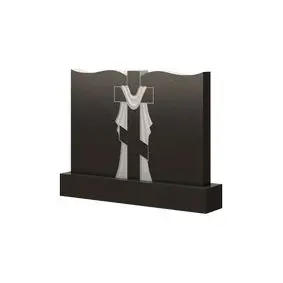 Интересная и очень красивая модель памятника, в которой тесно переплелись и религиозное направление, и ритуальная классика. Боковые грани представлены четкими прямыми вертикалями, а верхушку прочерчивают две элегантно изогнутые волнообразные линии, которые встречаясь в центре образуют вершину православного креста. Само распятие, украшающее надгробие, прорисовано по всей высоте лицевой стороны плиты и занимает центральное место в общем композиционном ансамбле мемориального изделия. Красиво обрамляет его изящно задрапированная белая плащаница. Памятник такой формы отразит особое отношение почивших к религии, а также достойно увенчает место их последнего пристанища.