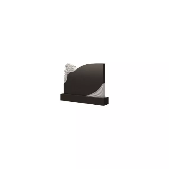 Привлекательность, очаровательность и грациозность данной модели придают резные элементы. Они находятся в правом нижнем и верхнем левом углу. Так, основание стелы оформлено образом белой драпированной ткани, который присутствует и в верхней части. Но стоит отметить, что здесь он дополнен красивыми и элегантными цветами, напоминающими лилии. Такое украшение как нельзя лучше подойдет для того, чтобы отобразить нежные и близкие взаимоотношения покойных при жизни. Кроме того, установив такой памятник на захоронение ваших родных, вы сможете выразить свою любовь и уважение к ним.