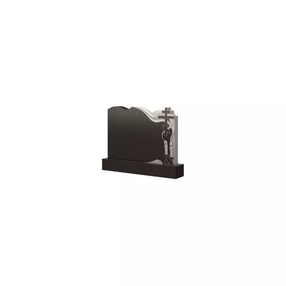 Типовая прямоугольная форма представленной модели памятника дополнена красивыми резными барельефами, украшающими лицевую сторону надгробной стелы. Две ярко пылающий восковых свечи, расположенные в правом нижнем углу у основания мемориального изделия, источают дым. Его клубы тонкими струйками поднимаются вверх, изящно обволакивая и обрамляя вершину плиты. Сквозь эту стелющуюся пелену проступает изображение небольшого православного креста, который формирует правый верхний угол и задает религиозное направление всему сооружению. Установленное на месте захоронения, такое надгробие привнесет ему эстетики и красоты.