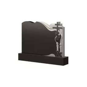 Типовая прямоугольная форма представленной модели памятника дополнена красивыми резными барельефами, украшающими лицевую сторону надгробной стелы. Две ярко пылающий восковых свечи, расположенные в правом нижнем углу у основания мемориального изделия, источают дым. Его клубы тонкими струйками поднимаются вверх, изящно обволакивая и обрамляя вершину плиты. Сквозь эту стелющуюся пелену проступает изображение небольшого православного креста, который формирует правый верхний угол и задает религиозное направление всему сооружению. Установленное на месте захоронения, такое надгробие привнесет ему эстетики и красоты.