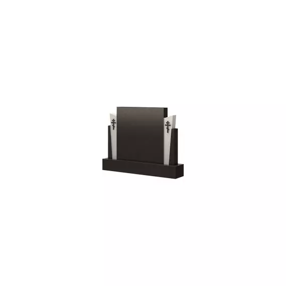 Величественная и строгая модель памятника, имеющая четкий и лаконичный силуэт, представленный ровными, прямыми линиями и остроконечными уголками. Вся конструкция сооружения состоит из нескольких элементов, которые гармонично дополняют друг друга, образуя целостное органичное изделие. Центральное место здесь отведено массивной прямоугольной стеле, по бокам которой симметрично располагаются по два фигурных элемента различной геометрии черного и белого цвета. Белые составные части дополнены небольшими резными православными крестами, подчеркивающими религиозную направленность надгробия. памятник такой формы достойно и с почетом обозначит родовую могилу, придав захоронению красивый и презентабельный вид.