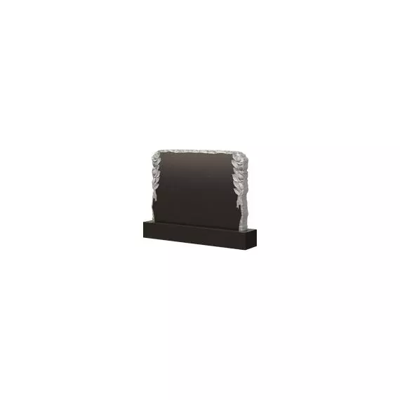 Модель памятник восхищает своим великолепием и элегантностью, которые заключаются в наличии небольшого количества резных элементов и неровных линий светлых оттенков. Так, оба верхних угла увенчаны барельефом прекрасных и очаровательных роз, символизирующих любовь, присутствующую между усопшими на протяжении всего жизненного пути. Кроме того, они являются словно неким обрамлением портретов, благодаря которому они будут отлично выделяться. Непременно стоит отметить, что все края надгробия обладают неровной поверхностью, что делает массивную памятную конструкцию более легкой и воздушной.