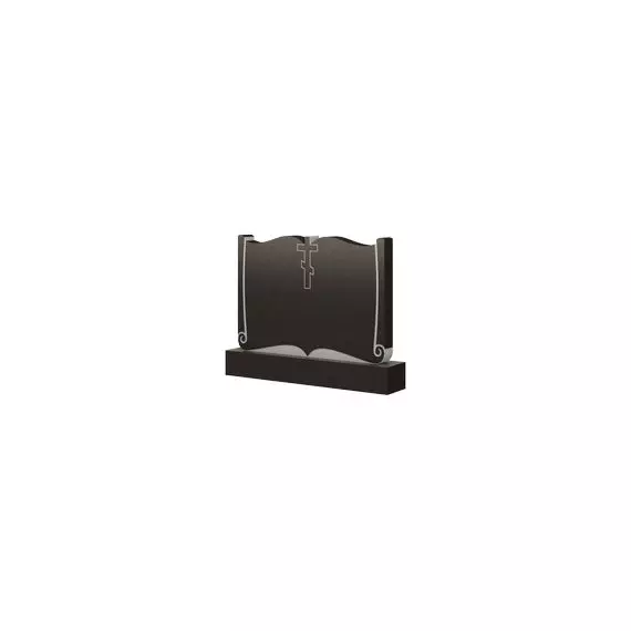 Интересная и необычная модель памятника с изящно изогнутым волнообразным верхом и строгими вертикальными боковыми гранями. Лицевую сторону надгробной стелы украшают резные изображения православного креста и узорные завитки, которые своими очертаниями прорисовывают силуэт раскрытой книги – символа мудрости, жизненного опыта и накопленных знаний. Мемориальное изделие такой изысканной формы очень достойно будет смотреться на любом семейном захоронении. Оно преобразит могильный участок, эффектно выделив его из общего ансамбля кладбища.
