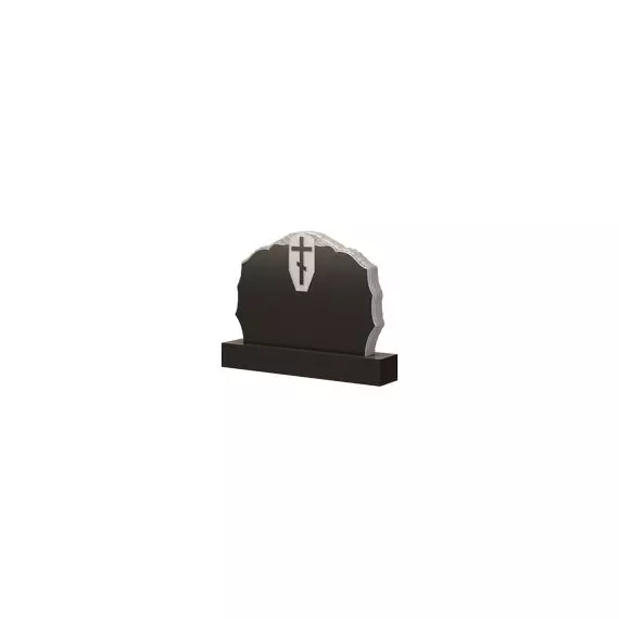 Интересная и необычная форма памятника, имеющая затейливый силуэт. Небольшие дуги, соединяясь между собой в остроконечные уголки образуют волнообразную кромку по всему контуру памятника, создавая легкий ребристый эффект. Усиливает его выполненная в виде корки поверхность каждой грани плиты. Особое внимание привлекает к себе лицевая сторона мемориального изделия, оформленная изображением православного креста, расположенного на белом фоне. Памятник такой формы подчеркнет особое отношение усопших к вероисповеданию, а также станет достойным и почетным обозначением любого родового захоронения.