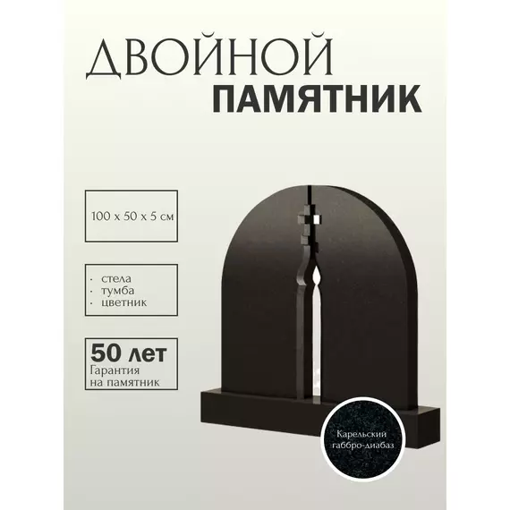 Красивая и утонченная модель памятника арочного типа. Крупные дугообразные линии боковых сторон и верхушки каждой стелы формируют единый четкий полукруг – силуэт мемориального изделия. Дополнением и неким вызывающим акцентом в композиции сооружения служит резное изображение тонкой свечи, увенчанной на пике огня небольшим православным крестом. Такой художественный узор наполнен глубоким смыслом и символизирует собой неугасаемое свечение душ почивших, теплоту и гармонию семейного очага, с легкой ноткой религиозного характера. Памятник такой формы красиво и достойно обозначит родовое захоронение.