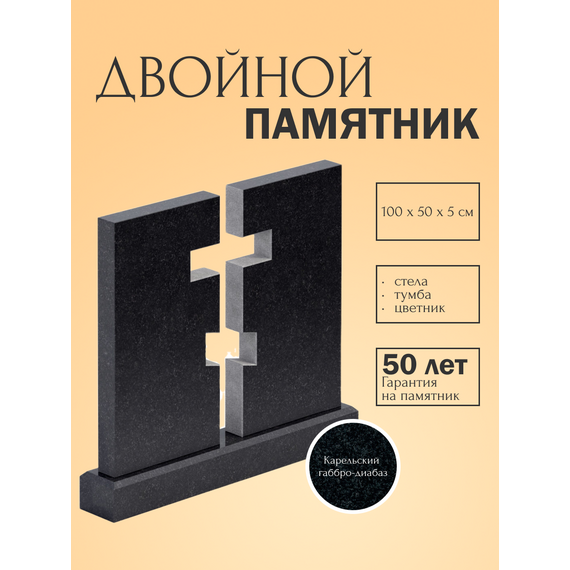 Резкая четкость и лаконичность наполняют конструкцию данной модели памятника, силуэт которой прорисован острыми прямыми линиями, точно следующим по своим направлениям. Две прямоугольные стелы, расположенные на одном основании в небольшом отдалении друг от друга, формируют целостное и органичное сооружение. В центральной части просматривается изображение креста, элементы которого прорезаны в боковых гранях каждой плиты. Он фокусирует на себе внимание, выдвигая на передний план центральную часть надгробия. Памятник такой формы будет одним из наилучших вариантов оформления последнего пристанища почивших родственников и отразит их особое отношение к религии.