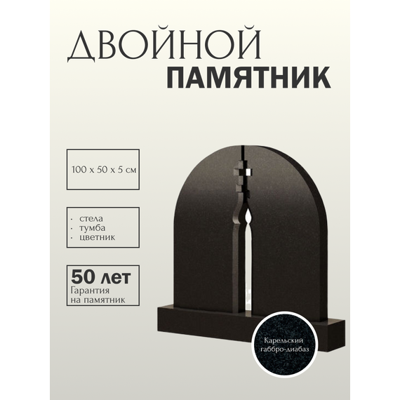 Красивая и утонченная модель памятника арочного типа. Крупные дугообразные линии боковых сторон и верхушки каждой стелы формируют единый четкий полукруг – силуэт мемориального изделия. Дополнением и неким вызывающим акцентом в композиции сооружения служит резное изображение тонкой свечи, увенчанной на пике огня небольшим православным крестом. Такой художественный узор наполнен глубоким смыслом и символизирует собой неугасаемое свечение душ почивших, теплоту и гармонию семейного очага, с легкой ноткой религиозного характера. Памятник такой формы красиво и достойно обозначит родовое захоронение.