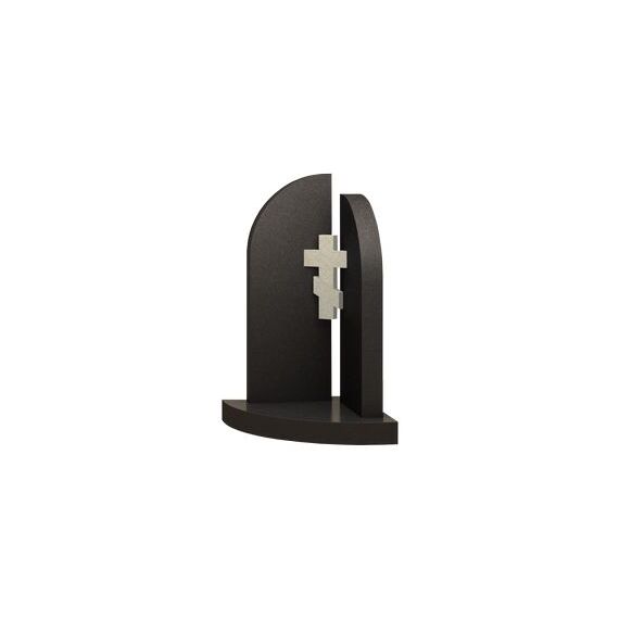 Представленная модель памятника интересна и необычна по своему наполнению. Конструкцию мемориального изделия образуют две изящные стелы и контрастный православный крест белого цвета, расположенный в центре сооружения. В основу формы плит заложен правильный прямоугольник – четкие и ровные вертикали, поднимающиеся от подножия, говорят об этом. Однако верхушка каждой стелы выполнена в более утонченных мотивах и прорисована крупной дугой, которая срезает один из острых углов. Распятие акцентирует внимание на себе и на верхней части сооружения. Оно подчеркнет особое отношение покойного к религии, а также станет своеобразным символом защиты, спасения и сохранения души усопшего.