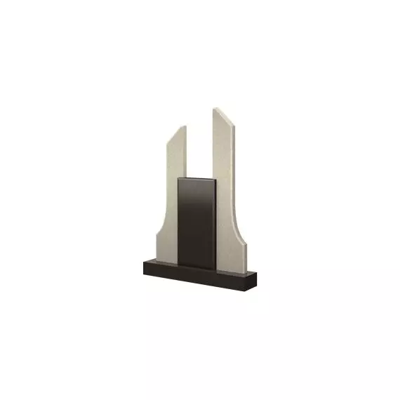 Представленная модель памятника имеет необычные и затейливые очертания, прорисованные и изящными плавными и резкими прямыми линиями. Основную и самую значимую часть мемориального сооружения представляет прямоугольная плита, которая контрастным пятном выступает на передний план конструкции и акцентирует на себе внимание. Задний план представлен двумя фигурными элементами белого цвета, своими очертаниями похожими на колонны. Одна из них чуть возвышается над другой, визуально увеличивая весь памятник в целом. Благодаря такому эффекту надгробие выглядит изысканно и утонченно. Оно придаст месту захоронения эстетически красивый и ухоженный вид.