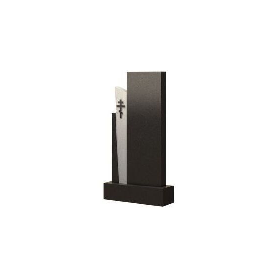 Модель памятника, имеющая строгую и сдержанную форму, визуально разделенную на три составляющие. Основной элемент надгробной стелы представлен в виде крупного прямоугольника правильной симметрии, четкими и ровными вертикалями поднимающийся от основания к вершине. Следующей по высоте идет трапециевидная вставка белого цвета, с небольшим скосом наверху. Ярким контрастом представлен на ней резной рельефный крест, наделяющий модель памятника религиозной символичностью. Завершает композицию мемориального изделия невысокая трапеция, прочерчивающая прямую линию левой боковой стороны. В памятнике такой формы отражается и строгость, и солидность, и величие сооружения.