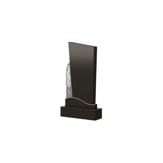 Представленная модель надгробного памятника выглядит достаточно просто, но при этом наличие небольшого резного оформления с левой стороны придает ей изысканность и оригинальность. Основная форма, где может быть размещена информация об усопшем и его портрет выглядит как трапеция, установленная на изящную волнообразную подставку. Что касается украшения, то это необработанная часть абстрактной фигуры, на которой вырезана лавровая ветвь, словно отображая достойно пройденный жизненный путь и рассказывая о всех преодоленных препятствиях, встречающихся на его протяжении.