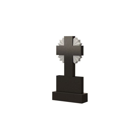 Данный памятник содержит в себе простые и прямые грани, которые создают форму креста. Изделие можно было бы отнести к классическим надгробиям, но его выделяют и делают своеобразным фигурные вставки в центре. Благодаря им, конструкция выглядит более элегантно и живописно. Кроме того, привлекательный внешний вид придает контрастность – светлые неотполированные веерообразные части и непосредственно памятник из темного камня. Надгробие такой модели поможет отобразить вероисповедание покойного, а также на протяжении долгих лет сохранить в памяти образ любимого человека.