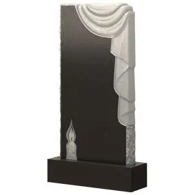 Представленная модель относится к категории стандартных памятников. Она имеет прямоугольную форму, украшенную белой ниспадающей плащаницей в правом углу. Кроме того, долю роскоши и символичности надгробию придает гравировка свечи в нижней части. Ее пламя горит ровно, словно показывая, что душа усопшего обрела покой, а его образ навсегда останется в памяти родных людей. Благодаря тому, что боковые стороны и небольшая часть верхушки обладает шероховатыми краями, памятник выглядит более изящно и воздушно, что позволит оформить могилу любимого человека самым наилучшим образом.