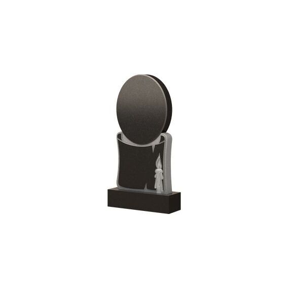 Памятник на изображении относится к категории фигурных. Модель довольно сложная, так как здесь используется несколько форм и разные элементы декора. Все вместе гармонично сочетается и ставит изделие в разряд шедевров ритуального искусства. Верхняя часть выполнена в форме овала, а нижняя прямоугольника, острые углы которого округлены. В качестве декора используется свиток пергамента, на котором впоследствии будет нанесена информация об умершем. Рядом изображается свеча – очень тонкий и изящный элемент. Ко всему прочему он весьма символичен: часто горящую свечу изображают как символ вечной памяти, почтения и поминовения.