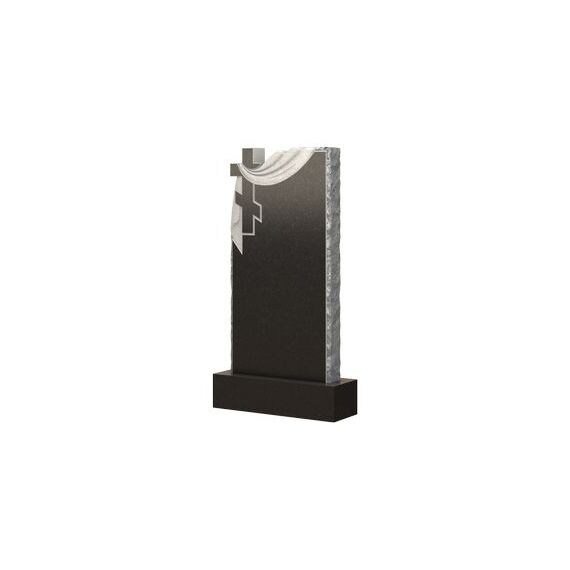 Этот памятник представляет из себя стандартную прямоугольную модель, чьи боковые грани имеют шероховатую поверхность. Благодаря этому, изделие выглядит более привлекательно, легко и воздушно. Кроме того, в правом верхнем углу находится силуэт православного креста, указывающий на религиозность покойного. С перекладины распятия свисает белая плащаница, одна часть которой обвивает верхушку и тем самым придает всей мемориальной конструкции грациозность и эстетику. Таким образом, великолепие данной модели заключается в простых линиях и небольшом оформлении.