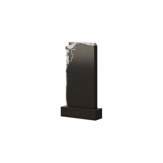 Сдержанная и лаконичная в своем выражении форма памятника. Правая боковая грань прочерчена четкими и ровными вертикалями, спускающимися от вершины надгробия к его основанию. Левый край и верх стелы представлены ломаными остроконечными линиями корки, проходящей контрастным акцентом по ее лицевой стороне. Резной рельефный крест, задрапированный плащаницей, красиво оформляет верхний левый угол, гармонично вписываясь в общий внешний вид мемориального изделия. Надгробие такой формы станет достойным венцом любого места захоронения и сохранит в памяти близких родной и любимый образ покойного.