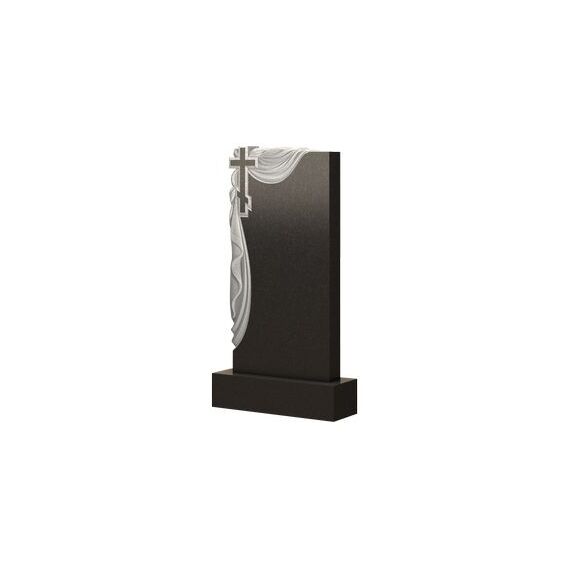 Простая и, в то же время, элегантно оформленная модель памятника. Четкий и ровный прямоугольник дополнен изящной резной драпировкой с левой стороны стелы. Крупными, плавными волнами, почти до самого основания надгробия, спускается по краю плиты белоснежная плащаница, красиво обрамляя православный крест, высеченный в левом верхнем углу сооружения. Благодаря такому оформлению внешний вид памятника создает атмосферу некой таинственности и умиротворения. Распятие определяет религиозную направленность мемориального изделия, которое станет достойным обозначением могилы верующего человека.