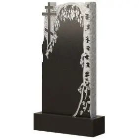 Довольно часто при оформлении памятников используют резные изображения деревьев. Одним из таких является береза – символ стройности, юности и нежности. Именно она изящно обрамляет стелу этой модели памятника, поднимаясь от основания надгробия красивым мощным стволом и раскидывая свои длинные струящиеся ветви на ее вершине. Густая листва словно поникла и безмолвно свисает вниз, выражая своим видом всю ту горечь и печаль, которыми наполнены сердца близких по почившему родственнику. Левый верхний угол прочерчен изображением православного креста, что определяет религиозную направленность мемориального изделия. Памятник такой формы будет достойно смотреться на любой могиле.
