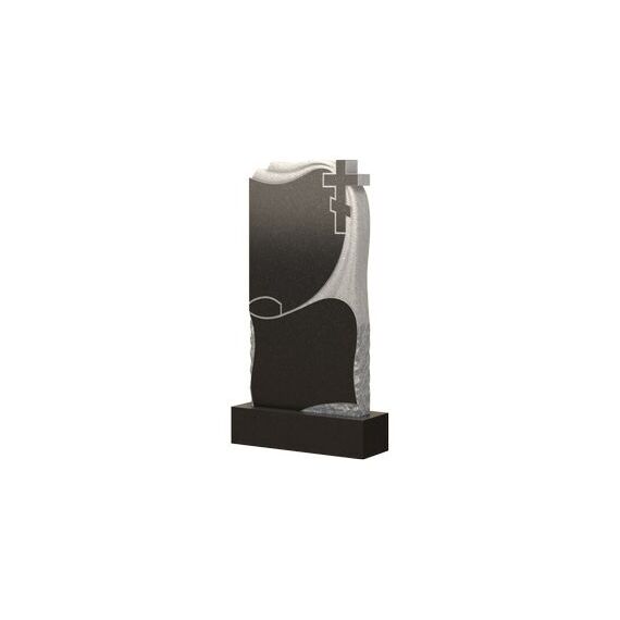 Сложная по композиционному наполнению модель памятника. Сам силуэт надгробия довольно прост и представляет собой несимметричный прямоугольник, представленный и ровными, и округлыми линиями. Основной акцент приходится на лицевую сторону стелы, где прорисован интересный резной узор. Правый верхний угол образуют православный крест и, обрамляющая вершину плиты и половину боковой грани, белоснежная плащаница. Нижняя часть памятника украшена резным изображением, напоминающим собой свернутый по углам лист бумаги и оформлена по краям коркой. Надгробие такой формы достойно обозначит могильный участок почившего близкого и дорогого человека.