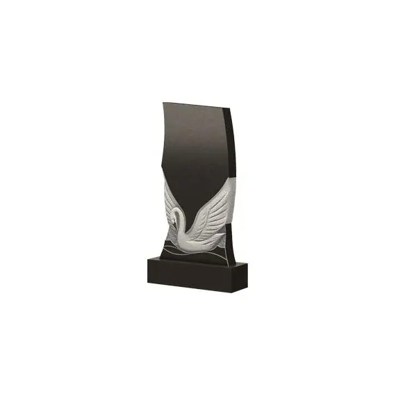 Памятник в форме ассиметричного прямоугольника, оформленный в нижней части стелы резным барельефом белого лебедя, плывущего по морским волнам. Голова птицы опущена – она как бы склоняется под тяжестью боли и скорби. Большие сильные крылья застыли в широком взмахе, распростертом по всей ширине плиты. Контрастность резного изображения акцентирует на себе внимание и, в то же время, придает памятнику изысканную утонченность. Четкие острые линии боковых граней привносят в изделие некую строгость и сдержанность. Надгробие такой формы станет достойным символом памяти на могиле любимого и родного человека.