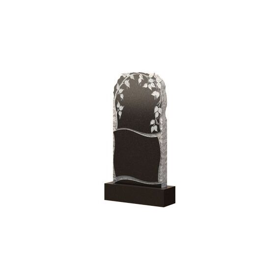 Это изделие можно назвать памятником в камне. Основная часть имеет вид каменной глыбы, на поверхности которого проступают две части для размещения портрета и имнформации об умерщем. Верхняя полированная поверхность дополнена березовыми ветками, символизирующими светлую печаль, а также придающие нотку эстетики внешнему виду надгробия. Полированные поверхности не отличаются прямыми углами. На изображении мы видим изогнутые линии, которые смягчают грубость нешлифованной поверхности. Различие в оттенках делают мемориальное изделие более художественным, мягким.