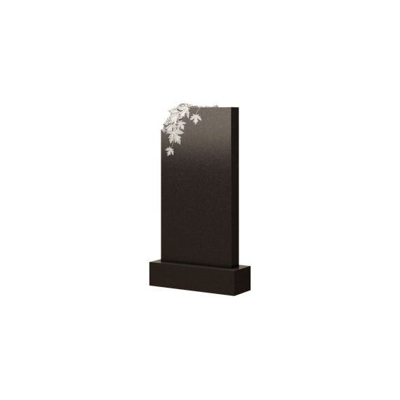 Простая прямоугольная форма со скошенным уголком разбавлена небольшим по площади нешлифованным элементом. Здесь, как букет цветов, проступает ветвь клена, одного из самых живописных видов деревьев. Несмотря на то, что в качестве оформления здесь выступает лишь небольшой фрагмент, памятник имеет довольно привлекательный внешний вид. Кленовые листья не отвлекают от информации об умершем и вместе с тем выделяют такое изделие из ряда классических моделей. Простота декора, строгие и лаконичные линии делают надгробие более утонченным, изящным.