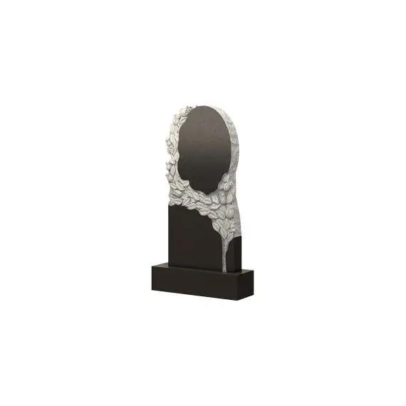 Оригинальная, наполненная аристократической утонченностью, модель памятника. Монолитное изделие визуально разделено на две части. Верхняя выполнена в виде крупного овала, края которого обрамлены коркой. Нижняя имеет более строгие и сдержанные очертания, заключенные в ровные и прямые линии боковых граней. По всей высоте красивой резной россыпью проходит барельеф. Многочисленные цветы и листья, вырываются из трещины, идущей от основания памятника и каскадом разлетаются по всей поверхности стелы, изящно обволакивая каждый элемент сооружения. В надгробии такой формы можно прочесть нежность и искренность чувств родных и близких по усопшему дорогому человеку.