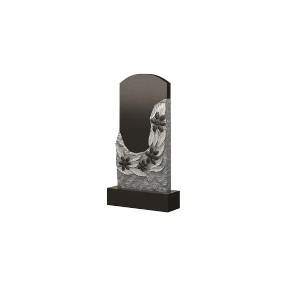 Представленная модель имеет довольно интересное решение: из большой каменной глыбы словно выплывает аккуратная стела. Она имеет ровные и прямые боковые грани, слегка закругленный верх, и в целом её можно назвать стандартной. Довольная большая часть поверхности изделия остается необработанной, но и здесь расположены изящные элементы — четыре цветка в окружении листьев. Количество цветов подчеркивает, что смерть стала утратой для близких. Сочетания внешней грубости и изящество придает особую привлекательность надгробию. Корка придают памятнику более внушительный, монументальный вид, присущий камню.