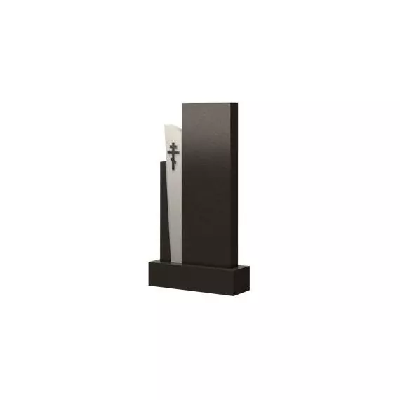 Модель памятника, имеющая строгую и сдержанную форму, визуально разделенную на три составляющие. Основной элемент надгробной стелы представлен в виде крупного прямоугольника правильной симметрии, четкими и ровными вертикалями поднимающийся от основания к вершине. Следующей по высоте идет трапециевидная вставка белого цвета, с небольшим скосом наверху. Ярким контрастом представлен на ней резной рельефный крест, наделяющий модель памятника религиозной символичностью. Завершает композицию мемориального изделия невысокая трапеция, прочерчивающая прямую линию левой боковой стороны. В памятнике такой формы отражается и строгость, и солидность, и величие сооружения.
