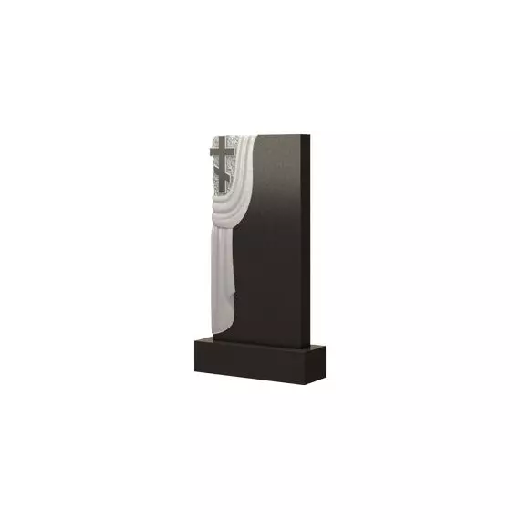 Классическая прямоугольная форма данной модели приобретает более оригинальный вид благодаря наличию резных элементов с левой стороны. Так, верхний угол украшен образом православного креста, который указывает на вероисповедание покойного. Кроме того, здесь присутствует вырезанная белая плащаница, спадающая с верхушки до основания и придающая монументальной конструкции более грациозный и элегантный внешний вид. Установив такое изделие на место захоронение дорогого человека, вы сможете не только выразить свою любовь к нему, но и на протяжении долгих лет сохранить в своей памяти его светлый образ.