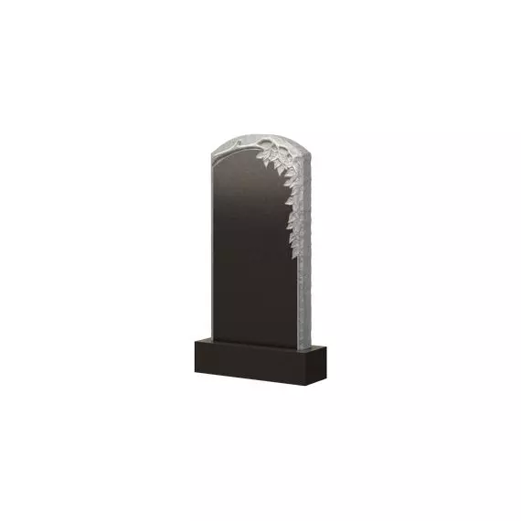 Форма этого памятника состоит из прямых боковых сторон с шероховатой поверхностью и дугообразной верхушки, где и заключается все основное оформление. Оно представляет из себя витиеватую ветвь дерева, с которой свисают листья и украшают центральную часть, а также правый край мемориального изделия. Таким образом, надгробный памятник приобретает природную тематику и тем самым становится способным идеально вписаться в траурную атмосферу сакрального места. Стоит отметить, что с помощью этого надгробия вы сможете представить покойного, как личность, которую все любили и уважали на протяжении всего жизненного пути.