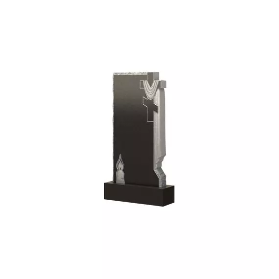 Этот памятник имеет стандартную форму, но не относится к классическим моделям, так как она разбавлена художественными элементами. Так, боковые грани не обработаны – это подчеркивает, что изделие изготовлено из прочного и надежного гранита, а также придает надгробию более величественный вид. В верхнем углу расположен главный символ христианства – крест, с которого ниспадает ткань, имеющая в ритуальном обиходе название «плащаница». Внизу изделия прорезано изображение горящей свечи, являющейся символом вечной памяти. Благодаря этим вставкам, казалась бы простая модель приобретает довольно привлекательный вид.