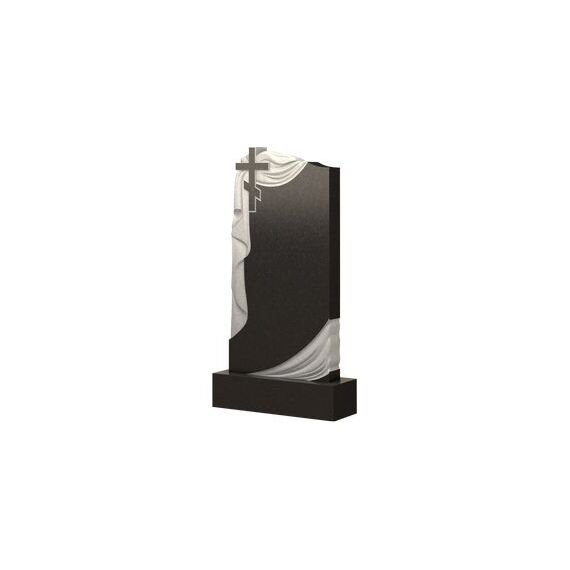 Памятник с крестом и плащаницей является весьма популярным мемориальным изделием. Распятие является не только украшением, но и соблюдением догматов христианских церквей. От него ниспадает ткань, которая и получила в ритуальной сфере название плащаницы. Изображение полотна делает памятник более нежным и зрительно выразительным, художественным. На представленной модели, ткань спускается с верху вниз, потом как бы изгибается и выходит на другой угол. Это делает оформление гармоничным, придает завершенный вид всему надгробию.