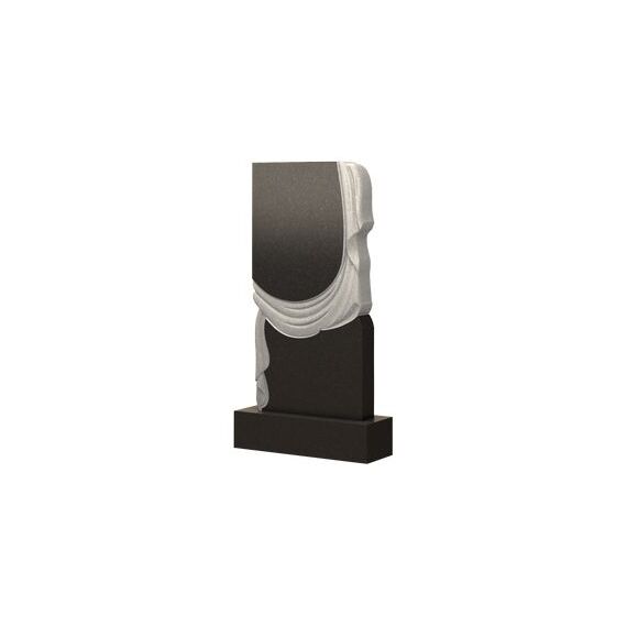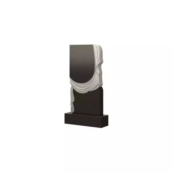 Представленный памятник не является стандартной или классической моделью. Простая форма в целом разделена струящейся тканью, которая делит надгробие на две части – верхнюю и нижнюю. Такой нестандартный способ разделить изделие на часть для портрета и часть для нанесения информации можно назвать удачным. Плащаница здесь является элементом оформления, добавляя красоту во внешний облик мемориала. А сочетание светлого и темного оттенков делают памятник более нежным и плавным.