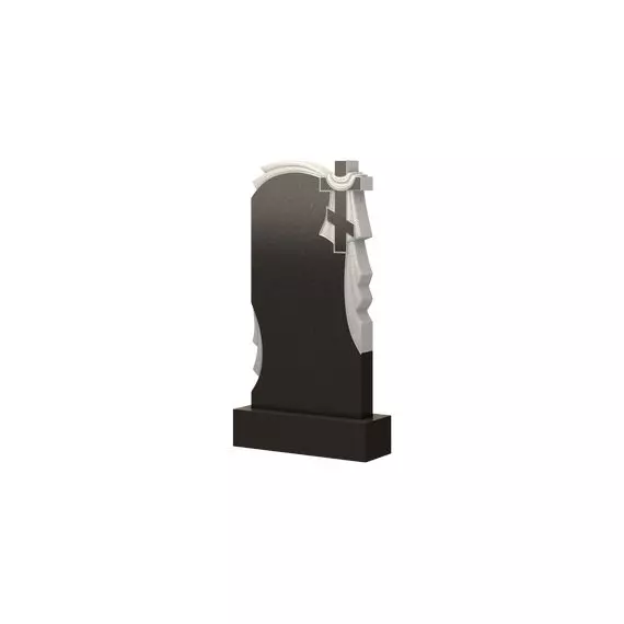 Эта модель памятника привлекает своей простотой и в то же время особой грациозностью. Дугообразная верхушка украшена небольшими рельефными вставками белого цвета и силуэтом православного креста, окутанного драпированной тканью. Боковые стороны имеют плавный изгиб и оформление в виде вырезанного ступенчатого узора, благодаря которому надгробие выглядит более эстетично и презентабельно. Установив данное мемориальное изделие на могилу вашего родного человека, вы сможете рассказать о том, что покойный чтил религиозные принципы и традиции, а также достойно обозначить его место захоронения.