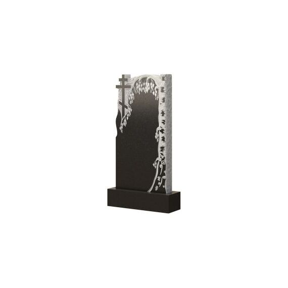 Довольно часто при оформлении памятников используют резные изображения деревьев. Одним из таких является береза – символ стройности, юности и нежности. Именно она изящно обрамляет стелу этой модели памятника, поднимаясь от основания надгробия красивым мощным стволом и раскидывая свои длинные струящиеся ветви на ее вершине. Густая листва словно поникла и безмолвно свисает вниз, выражая своим видом всю ту горечь и печаль, которыми наполнены сердца близких по почившему родственнику. Левый верхний угол прочерчен изображением православного креста, что определяет религиозную направленность мемориального изделия. Памятник такой формы будет достойно смотреться на любой могиле.