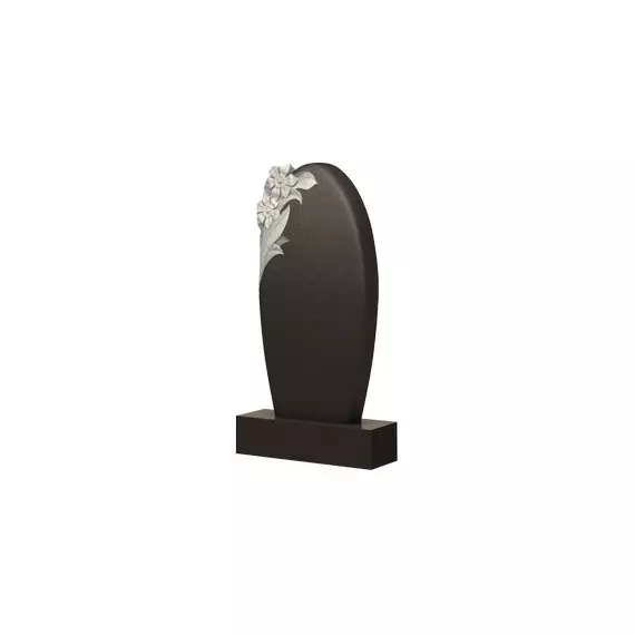 Модель на изображении сразу обращает на себя внимание своей плавностью, изящностью. Грани и углы мягко скруглены, поэтому форма напоминает овал. В верхней части присутствует вставка в виде небольшой резной цветочной композиции. Это не только элемент, который добавляет эстетичность надгробию, но и один из способов выразить свою любовь к умершему, подчеркнуть то, что его помнят и будут помнить. С незапамятных времен люди возлагали цветы на могилу. Сегодня, эта традиция нашла свое продолжение в ритуальном искусстве и цветы стали украшением многих моделей памятников.
