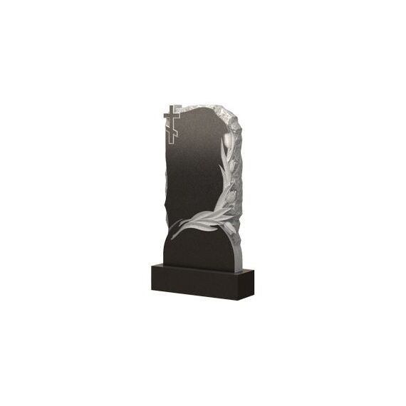 Величественно и красиво будет смотреться на могилке дорогого и любимого человека памятник такой формы и наполнения. Модель мемориального изделия выражает целую гамму чувств – и любовь, и нежность, и печаль, и скорбь, которые слились воедино, пронизывая все сооружение. Контур надгробия оформлен коркой, придающей ему замысловатый и интересный внешний вид. Лицевая сторона стелы визуально разделена на две части букетом нежных цветущих тюльпанов. В левом верхнем углу прорезан православный крест, который определяет религиозную направленность памятника и придает ему особую выразительность.