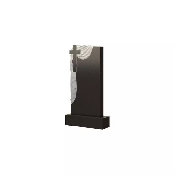 Классическая модель памятника прямоугольной формы, дополненная декоративным контрастным резным барельефом креста с плащаницей, обрамляющим левую боковую сторону стелы. Само распятие имеет четкий и ровный силуэт, прорисованный прямыми линиями. Белая ткань красивой драпировкой изящно ниспадает, образуя волны крупных и мелких складок и, как бы, скрывает часть памятника. Вся композиционная форма изделия являет собой отражение тихой и молчаливой скорби, наполняя его внутренней сдержанностью и лаконичностью. Могила, на которой будет установлено такое надгробие приобретет красивый и достойно оформленный внешний вид.
