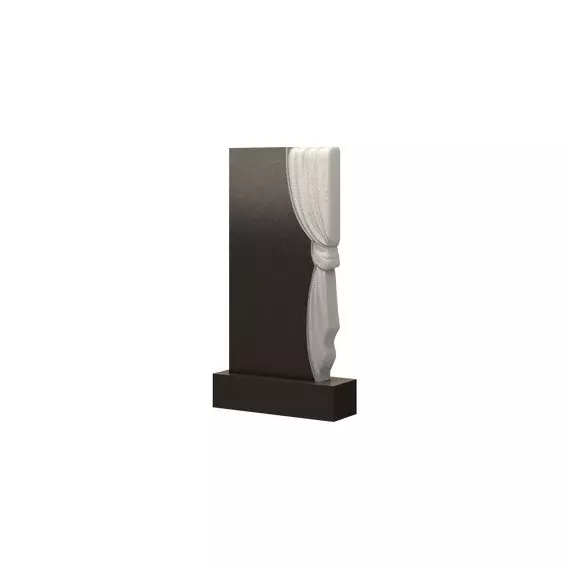 Довольно сдержанная и лаконичная форма памятника, наполненная особым внутренним смыслом. В одном изделии слились два цвета, два контраста, которые, гармонично дополняя друг друга, воплотились в монолитной каменной стеле. Левая часть надгробия весьма проста и представлена четкими прямыми линиями, соединяющимися на вершине остроконечным углом. Правая сторона памятника более изящна – по боковой грани от верхушки до основания простирается красиво убранная белая плащаница, похожая на массивную театральную кулису. В силуэте мемориального изделия такой формы можно прочесть целую гамму чувств, которыми наполнены сердца родных по усопшему близкому человеку.