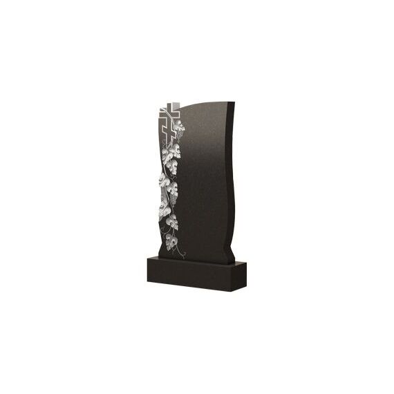Интересная и, в то же время, достаточно лаконичная форма памятника, напоминающая своими очертаниями большой глиняный кувшин. Его правый верхний угол слегка заострен и приподнят, точь-в-точь, как носик у сосуда. Левая сторона надгробной стелы имеет красивое рельефное оформление по всей своей высоте. Небольшой православный крест расположился в верхней ее части – он задает религиозную направленность надгробию. Изящная виноградная лоза, обвивая распятие, свисает вниз и спускается практически до самого основания мемориального изделия. Вся эта композиция гармонирует с общим видом памятника составляя целостное и завершенное сооружение.