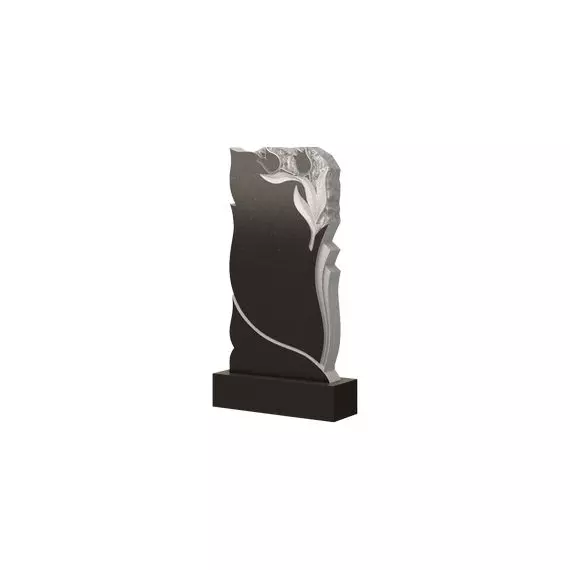 Эмоционально выразительная и внутренне насыщенная форма памятника, выполненная в виде пылающего огня. Языки пламени, словно раздуваясь на ветру, порываются в разные стороны, разгораясь все ярче и жарче. Небольшой букет тюльпанов, расположенный в верхней части стелы, как бы сдерживает все это пылающее естество, направляя потоки огня в нужную сторону. Правая боковая грань декорирована волнообразными контрастными выступами, элегантно дополняющими общий вид конструкции. С помощью надгробия такой формы можно абсолютно полно отразить все те чувства, которые испытывают родные к почившему близкому человеку.