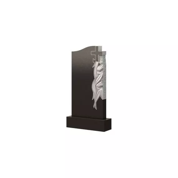 Фигурный памятник представленной модели станет отличным вариантом, для того чтобы достойно обозначить место захоронения любимого человека. В целом, надгробие представляет из себя изделие с прямыми линиями и волнообразной верхушкой. Но живописность и великолепие ему придает оформление в правом верхнем углу. Здесь вырезан образ креста, указывающего на вероисповедание покойного. Кроме того, распятие украшают два вырезанных тюльпана. Они символизируют печаль родных людей, испытываемую в связи с утратой и мягкий нрав, присущий покойному при жизни.