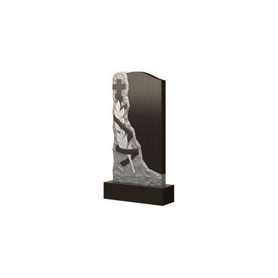 Эта модель — удивительное сочетание полированной и необработанной поверхностей. На корке проступают сложные узоры — здесь присутствует крест, как символ принадлежности к христианству, а также веточка, переплетенная с лентой, означающая вечную память и почтение. Полированная часть памятника тоже неоднородна — прямая грань переходить в плавные изгиб, что позволяет смягчить угловатость. Модель хорошо подойдет мужчине, потому как такое художественное решение способно подчеркнуть силу, твердость характера. Вместе с тем, цветовая гамма надгробия выражает печаль, скорбь и любовь.