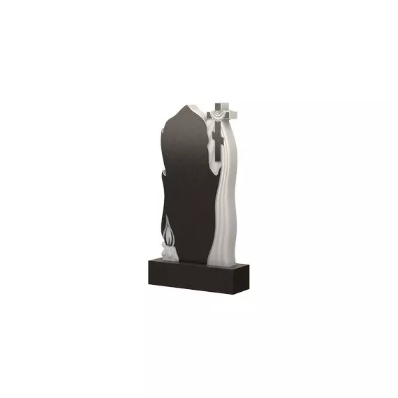 Данная модель надгробного памятника содержит в себе фигурные боковые грани, которые замыкаясь в верхушке в виде заостренного уголка создают образ пламени. Крест, в правом верхнем углу оформленный плащаницей белого цвета, говорит о религиозной принадлежности покойного. Силуэт спокойно горящей свечи словно напоминает о том, что умерший человек обрел вечный покой, а его светлый образ навсегда останется в памяти родных и близких. Надгробие выглядит довольно контрастным, потому что многие элементы являются резными, благодаря чему изделие становится более изысканным и обворожительным.
