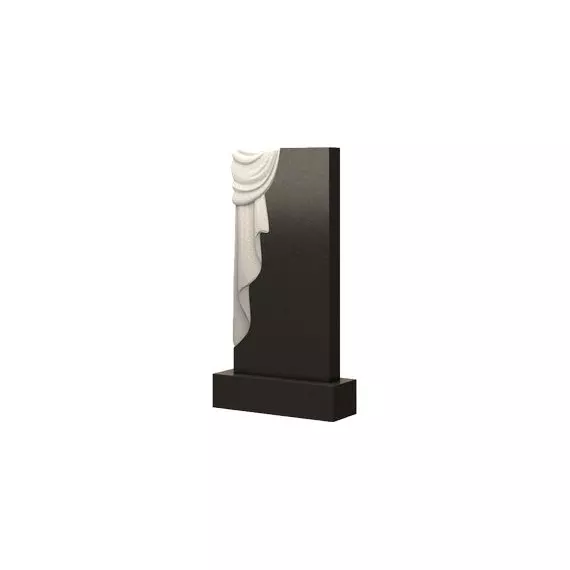 Строгая и лаконичная прямоугольная форма модели памятника разбавлена декоративным барельефом. Резное изображение плащаницы красиво обрамляет верхний левый угол стелы и струящимися белыми складками спадает к основанию надгробия. Крупные волны драпировки придают объемности ткани, создавая визуальный эффект небрежно наброшенной материи. Силуэт надгробия целостен и гармоничен, в нем нет ничего лишнего. С помощью такой формы памятника можно передать все самые искренние и глубокие чувства родных и близких к ушедшему в мир иной дорогому и любимому человеку.